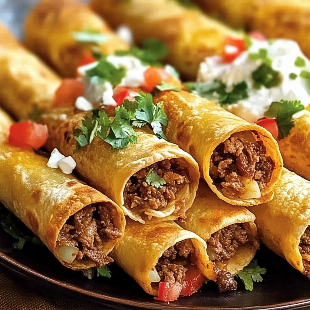 Oven Baked Beef Taquitos are rolled tortillas filled with seasoned ground beef and cheese, baked until crisp. They make a delicious snack or meal option.